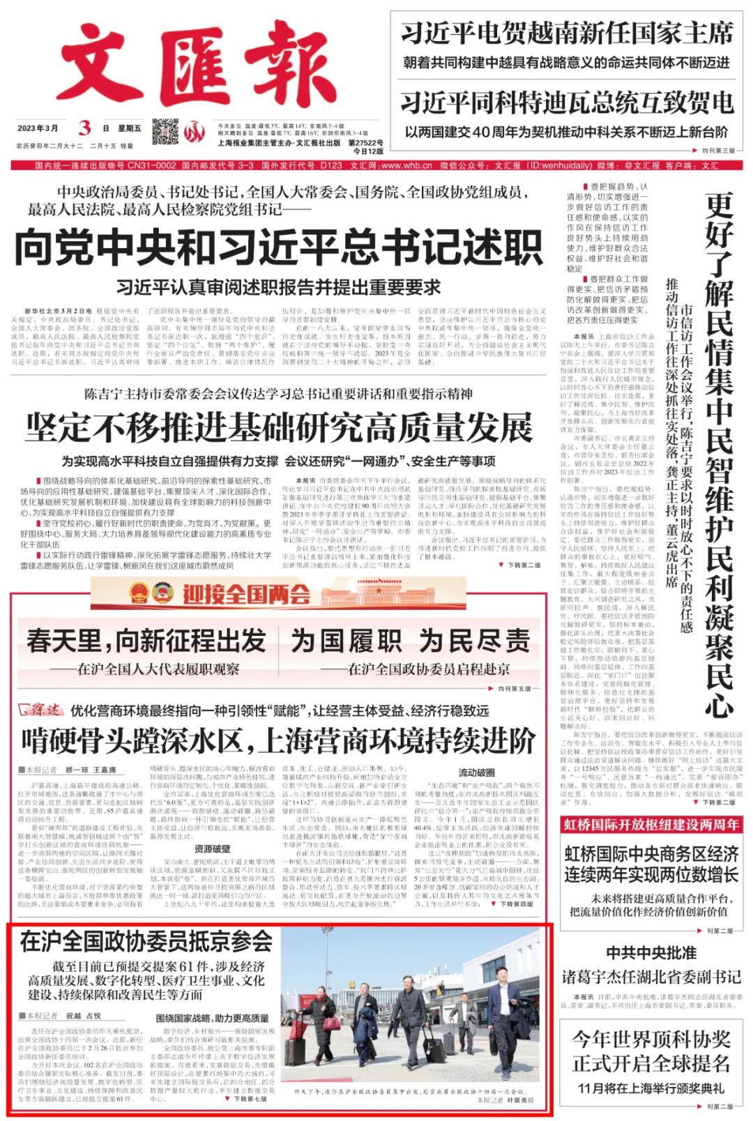 文汇报 头版丨在沪全国政协委员抵京参会