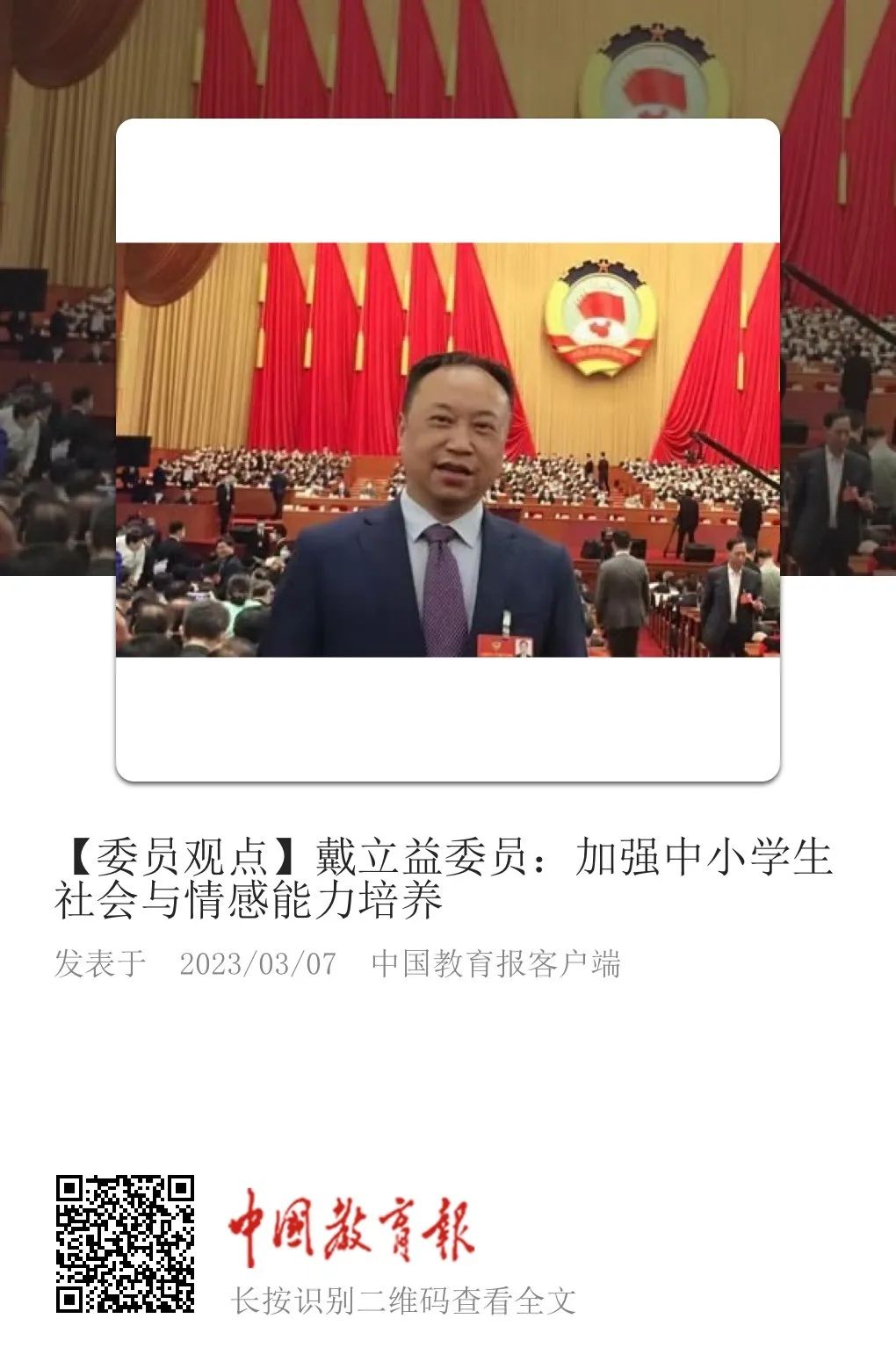 劳动报丨全国政协委员戴立益:深入推进中小学生社会与情感培养
