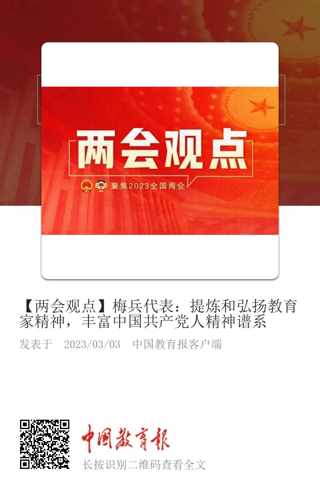 中国教育报客户端丨【两会观点】梅兵代表:提炼和弘扬教育家精神,丰富中国共产党人精神谱系
