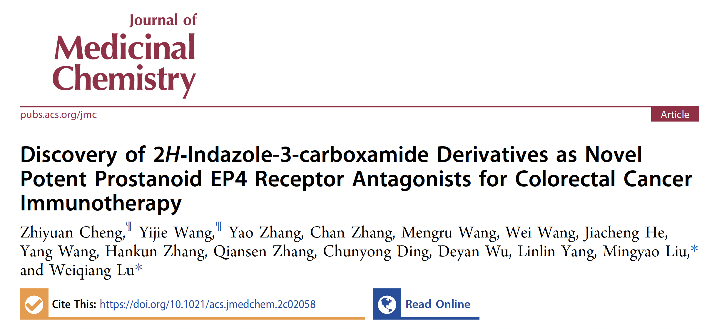 该成果近期以 Discovery of 2H‑Indazole-3-carboxamide Derivatives as NovelPotent Prostanoid EP4 Receptor Antagonists for Colorectal Cancer Immunotherapy 为题在线发表在药物化学领域国际顶级期刊 Journal of Medicinal Chemistry 上,并被选为期刊主封面(Front Cover)。beat365正版唯一官网生命科学学院博士研究生程志远和硕士研究生王义杰为本论文的共同第一作者,刘明耀教授和卢伟强研究员为本论文的共同通讯作者。该研究得到了上海交通大学丁春勇研究员,海南大学吴德燕教授,郑州大学杨琳琳教授以及本校张乾森研究员等合作伙伴的大力支持和帮助。