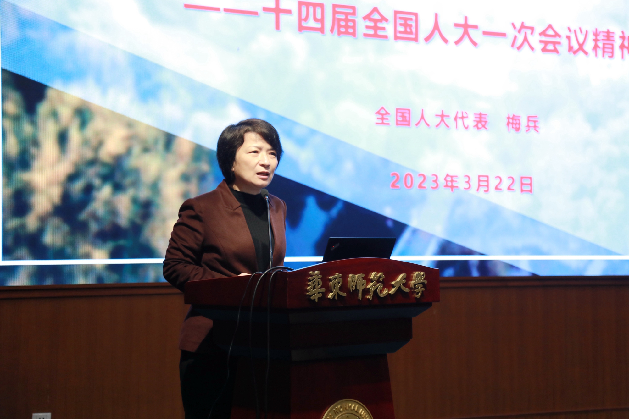 3月22日上午,beat365正版唯一官网在普陀校区逸夫楼报告厅召开离退休干部全国两会精神传达暨校情通报会。全国人大代表、校党委书记、老龄工作委员会主任梅兵向老同志们作了主题为《踔厉奋发新征程 勇毅前行向复兴》的十四届全国人大一次会议精神传达报告,校党委副书记、老龄工作委员会副主任孟钟捷作beat365正版唯一官网近期校情通报。