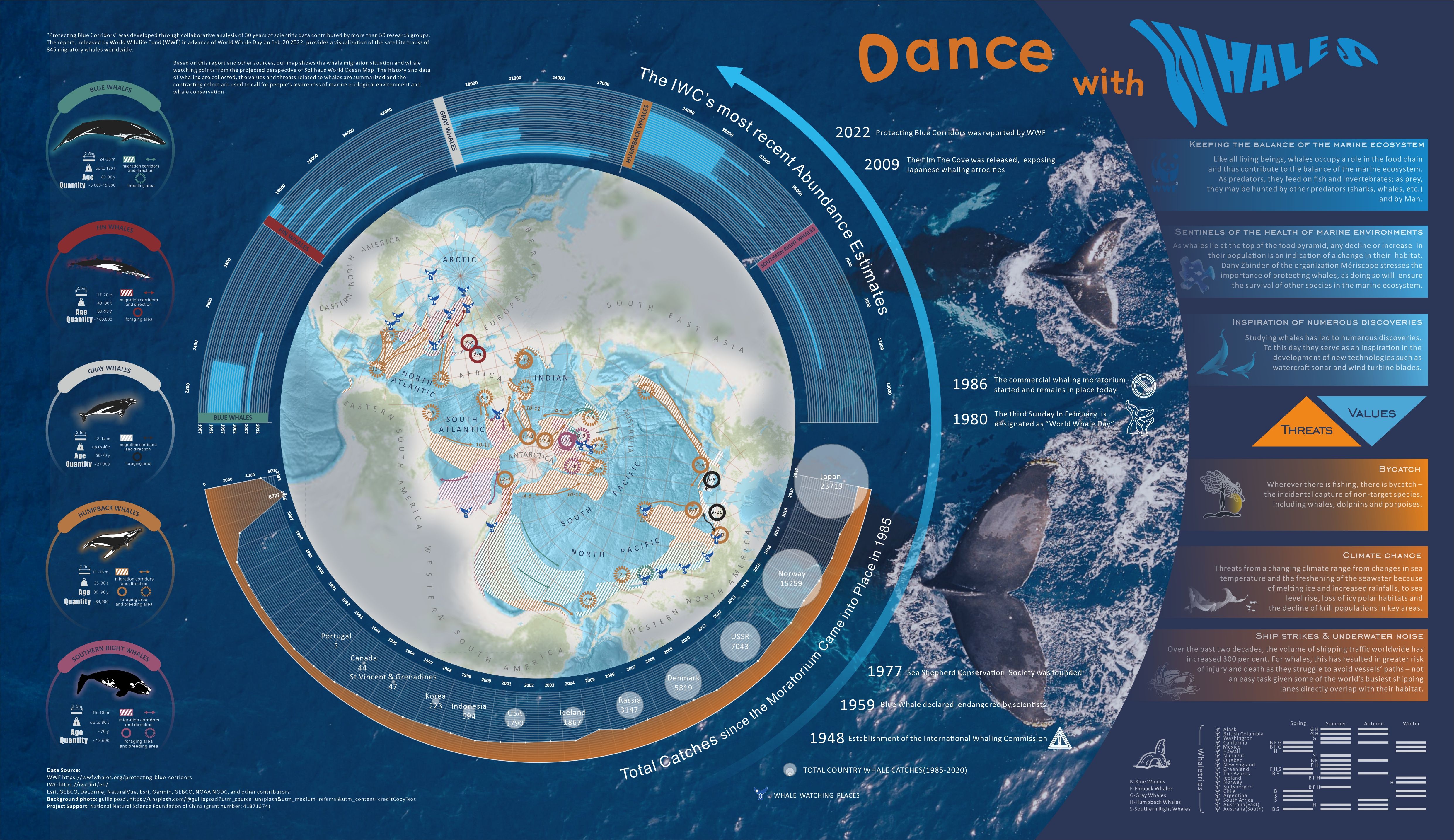世界上三分之一的鲸类被国际自然保护联盟(IUCN)列为濒危物种,减轻鲸鱼生存威胁已刻不容缓。确定鲸鱼最重要的栖息地和迁徙路线,并通过直观有效的科普方式宣传展示,是提高人类的认知,保护鲸鱼的迁徙区域——蓝色廊道的重要任务。