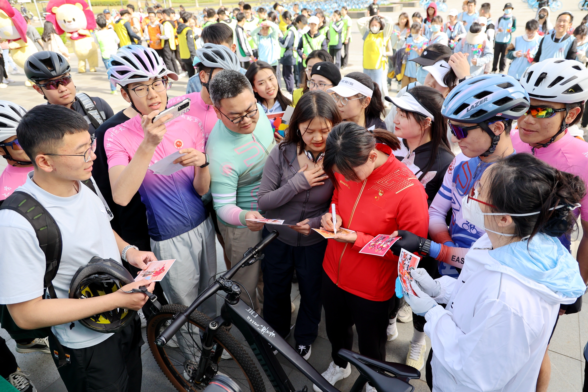 发令枪响后,钟天使带领骑行团从图书馆出发,沿着“文脉廊—樱桃河”环骑校园,奥运红、单车蓝与师大青年的青春身影共同构成了春日校园中最生动的一抹亮色。