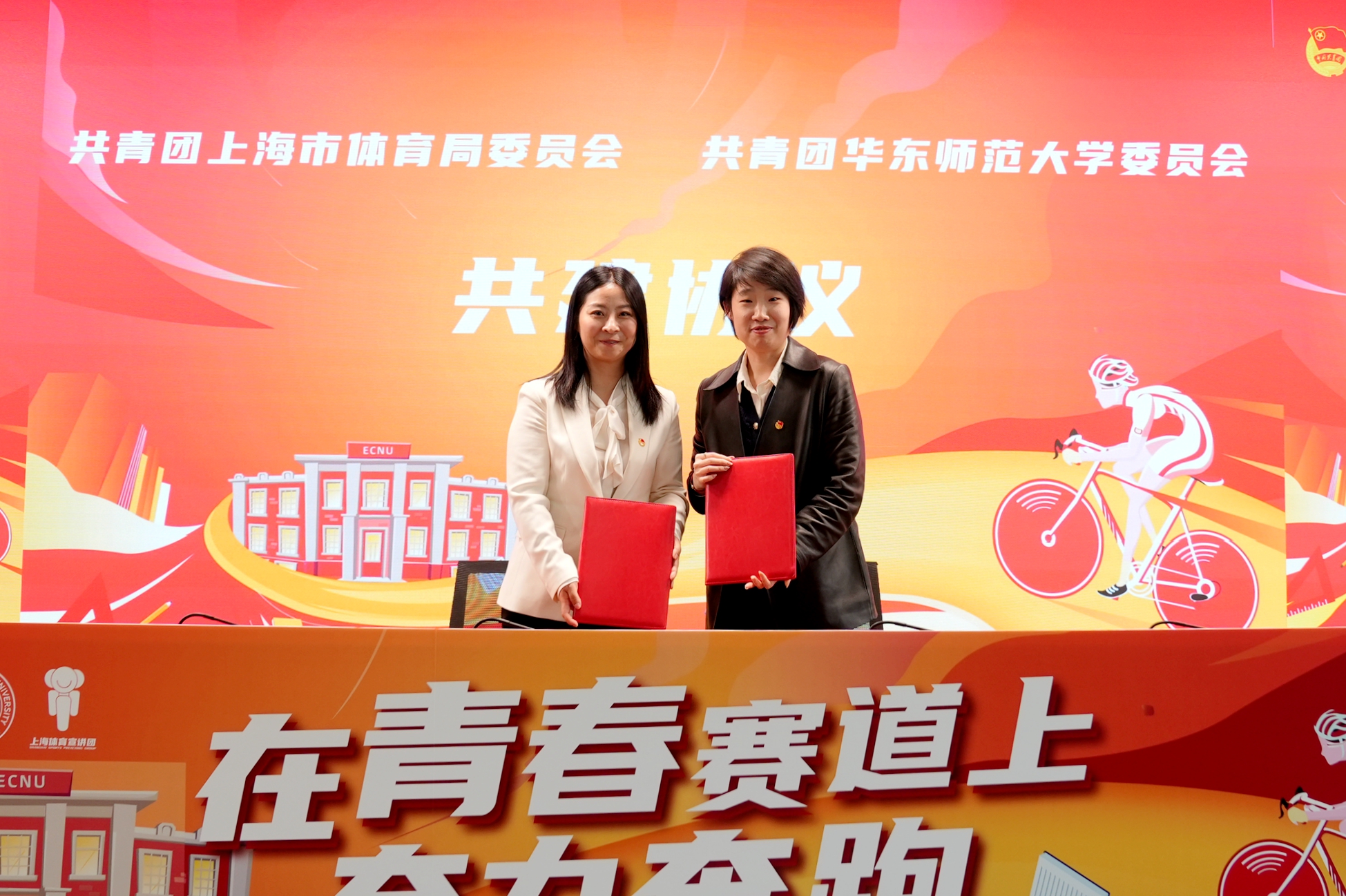 华东师大团委书记俞虹与上海市体育局团委书记崔燕代表双方签署合作共建协议