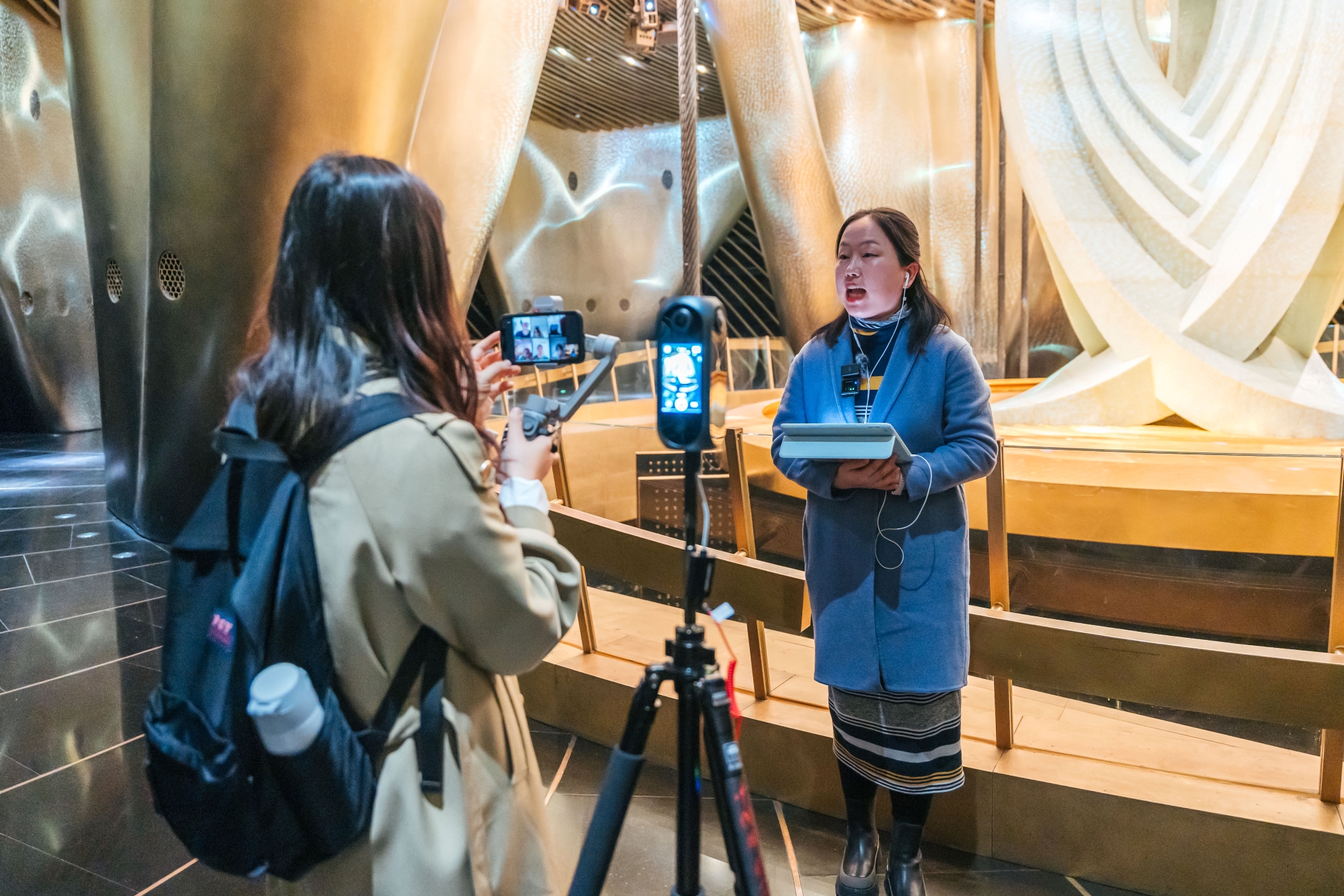 展示发布会当天,国际中文日项目管理教师濮若依带领在场嘉宾参观了“体验营”成果展,向线下线上观众介绍了本次VR全景实境课程的背景、筹备过程、团队成员、学员反馈以及多维平台直播所带来的挑战。主讲教师刘嘉怡就三门全景实境直播课程的设计理念、创新思路等进行了介绍。“体验营”全程回顾纪录片也在此次展示发布会上首播。
