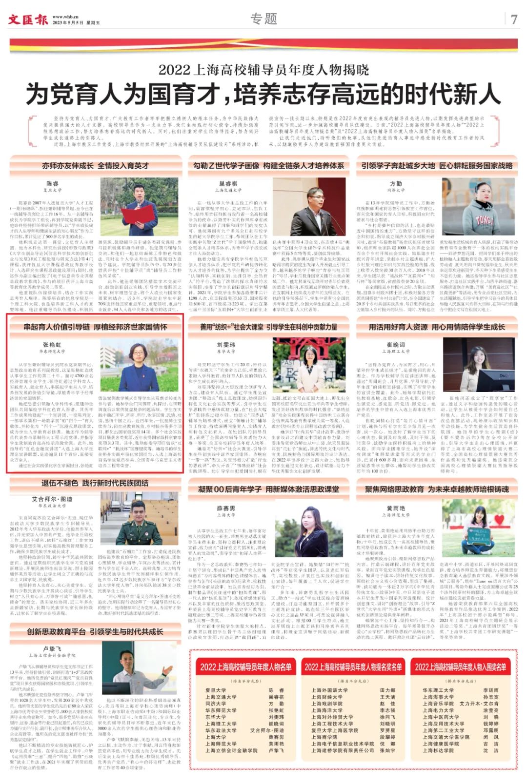 《文汇报》2023年5月5日7版整版报道年度人物事迹