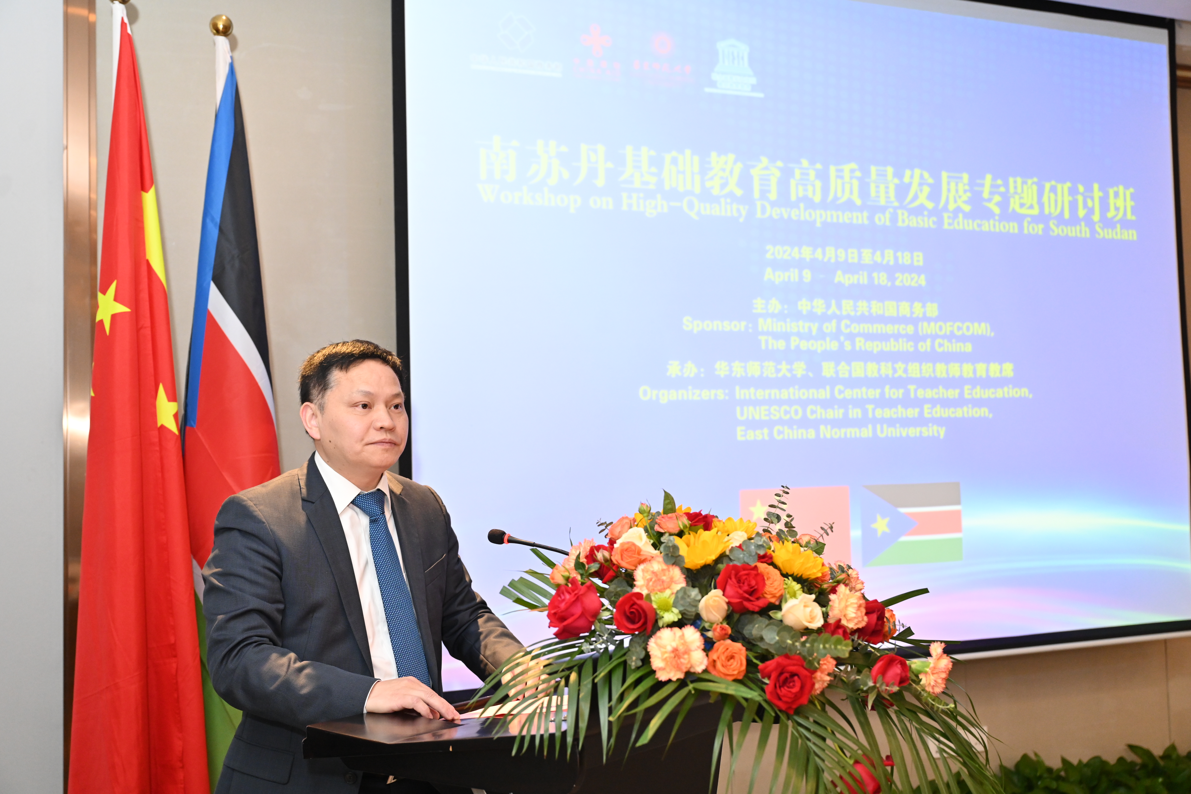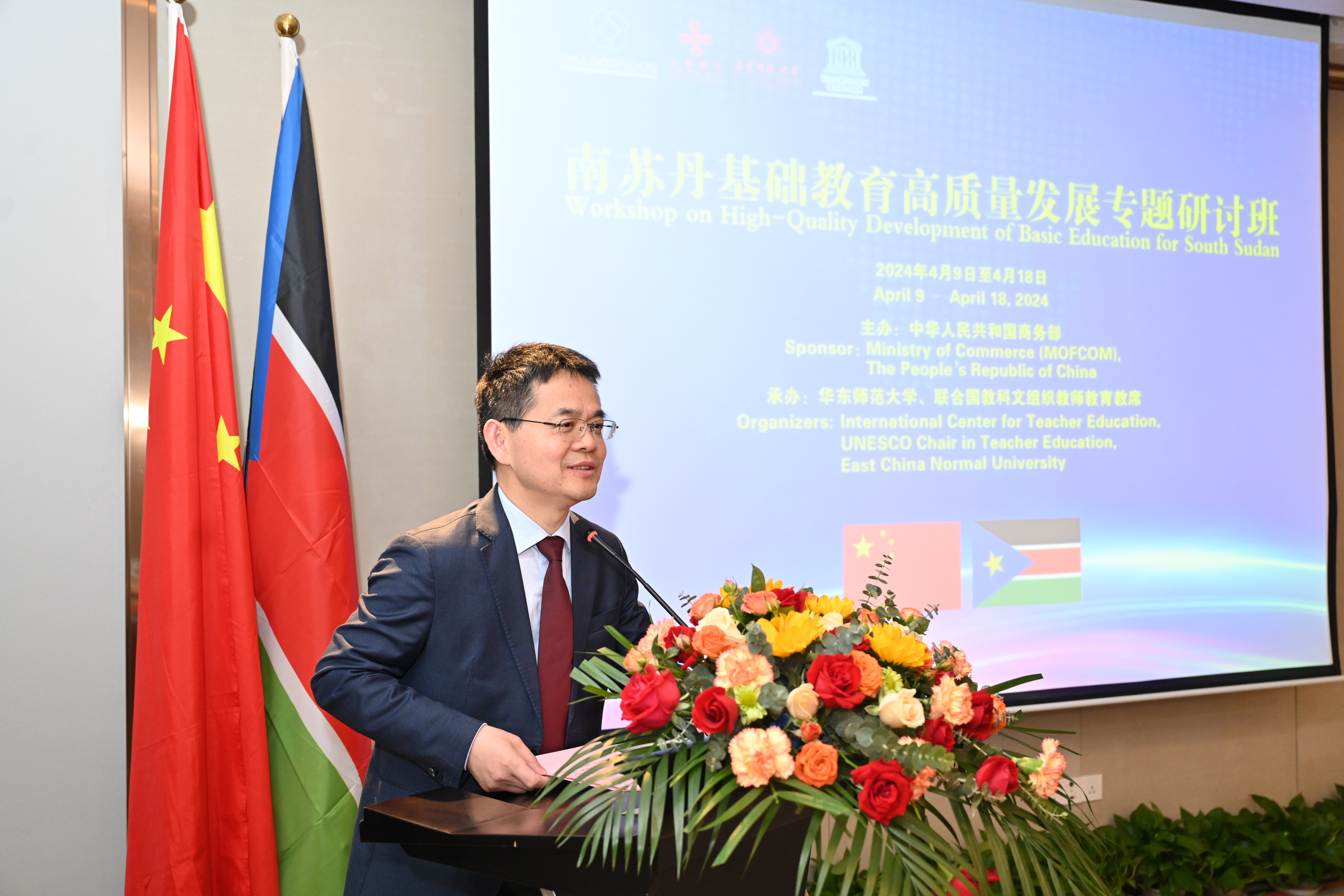 4月9日,由中国商务部主办、beat365正版唯一官网承办的中国商务部南苏丹基础教育高质量发展专题研讨班开班仪式举行。华东师大党委书记、联合国教科文组织教师教育教席主持人梅兵,上海市商务委员会总经济师罗志松,华东师大教师教育学院院长代蕊华、国际教育中心副主任金丽君以及联合国教科文组织教师教育教席办公室相关工作人员参加了开班仪式。开班仪式由国际教师教育中心主任彭利平主持。