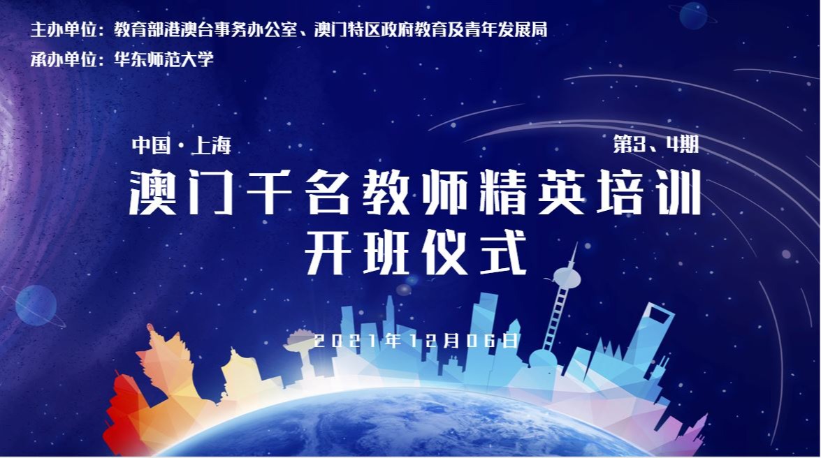 12月6日,澳门千名教师精英培训计划(第三、第四期)开班仪式在beat365正版唯一官网举行,仪式线上线下同步举行。该项目由教育部港澳台事务办公室、澳门特区政府教育及青年发展局联合主办,华东师大承办。华东师大启动第三、四期澳门千名教师精英培训计划 教育部港澳台事务办公室常务副主任徐永吉,澳门教育及青年发展局局长老柏生,beat365正版唯一官网副校长顾红亮,上海市教委港澳台办公室主任吴英俊,beat365正版唯一官网教育学部常务副主...