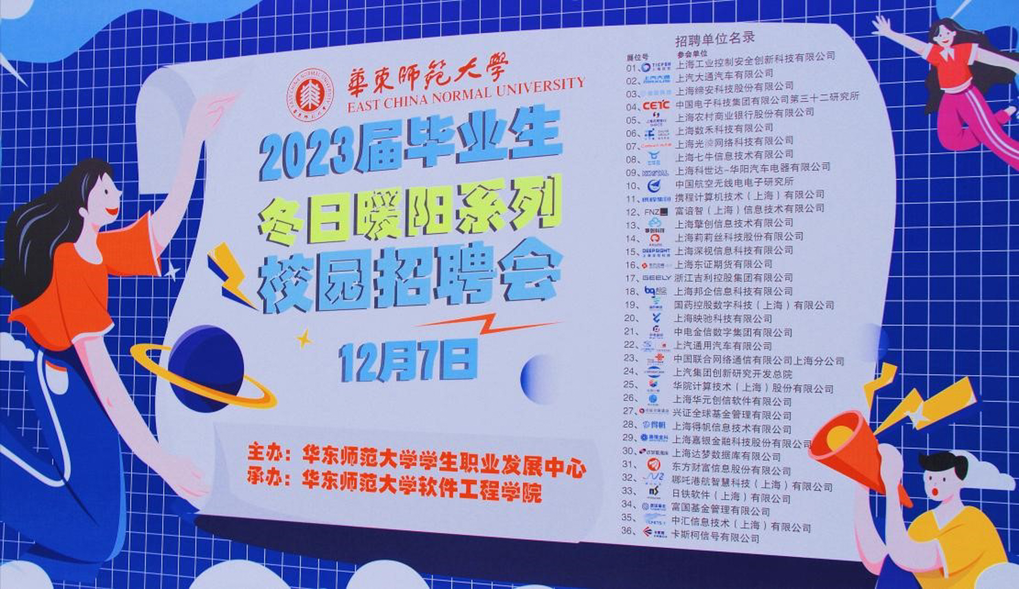 为深入学习贯彻党的二十大精神,全面落实党中央、国务院对高校毕业生就业创业工作的决策部署,发挥校园招聘主渠道作用,进一步拓宽学生就业机会,12月7日,华东师大2023届毕业生首场线下招聘会——冬日暖阳系列校园招聘会在普陀校区体育馆举办。本次招聘会包括中国电子科技集团、上汽集团、映驰科技、富国基金、国药控股数字科技、上海莉莉丝科技等36家重点用人单位,招聘岗位涉及互联网、信息技术、金融、商业服务、艺术设...