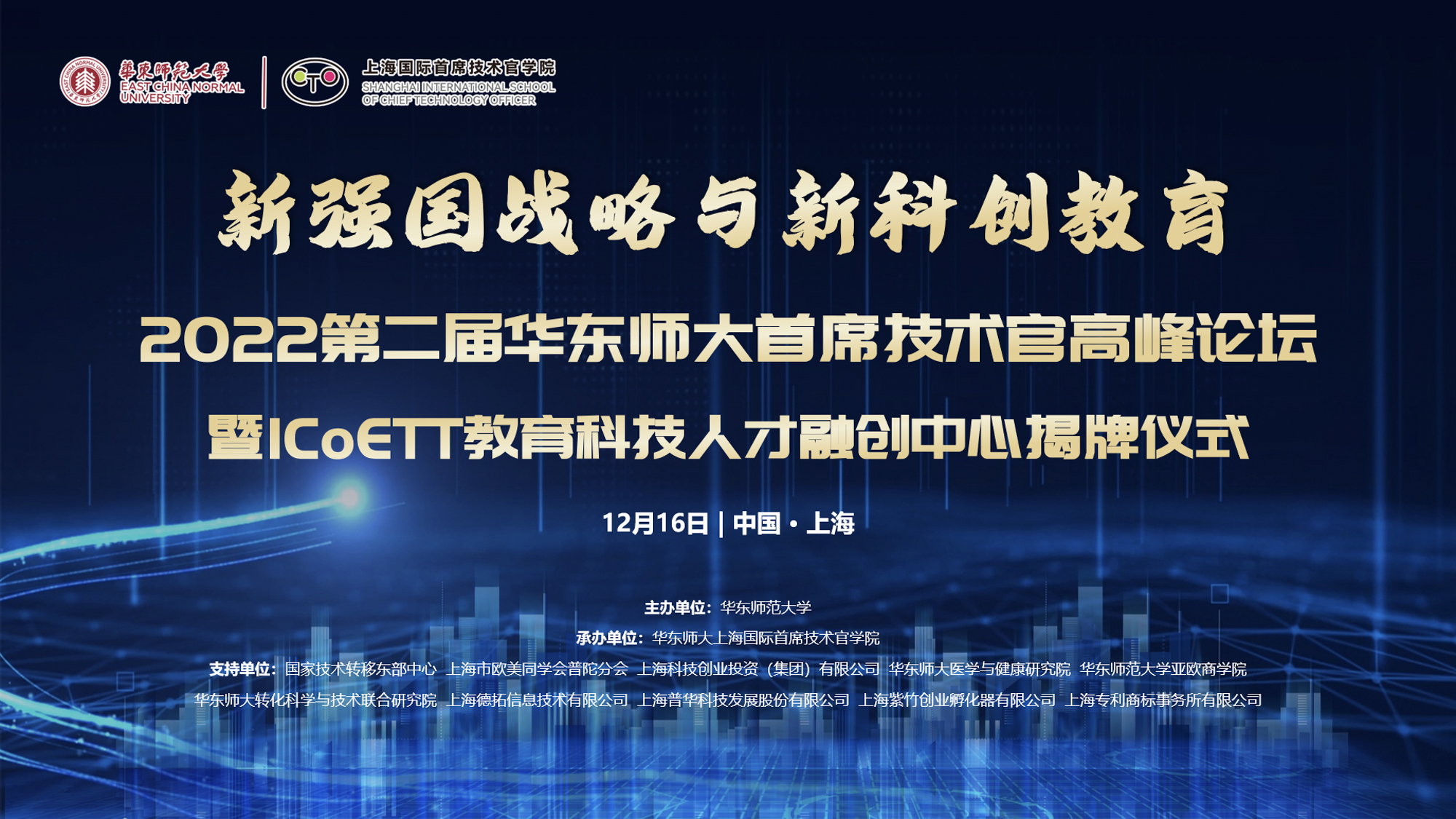 12月16日,由华东师大主办,华东师大上海国际首席技术官学院(以下简称“CTO学院”)承办的“新强国战略与新科创教育——2022第二届华东师大首席技术官高峰论坛暨ICoETT教育科技人才融创中心揭牌仪式”于线上举行。本次论坛得到国家技术转移东部中心,上海市欧美同学会普陀分会,上海科技创业投资(集团)有限公司,华东师大医学与健康研究院、亚欧商学院、转化科学与技术联合研究院,上海德拓信息技术有限公司,上海普...